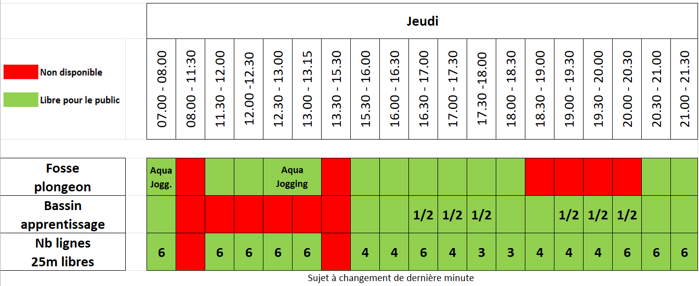 | Jeudi | 07:00 – 08:00, 11:30 – 13:15, 15:30 – 21:30 |