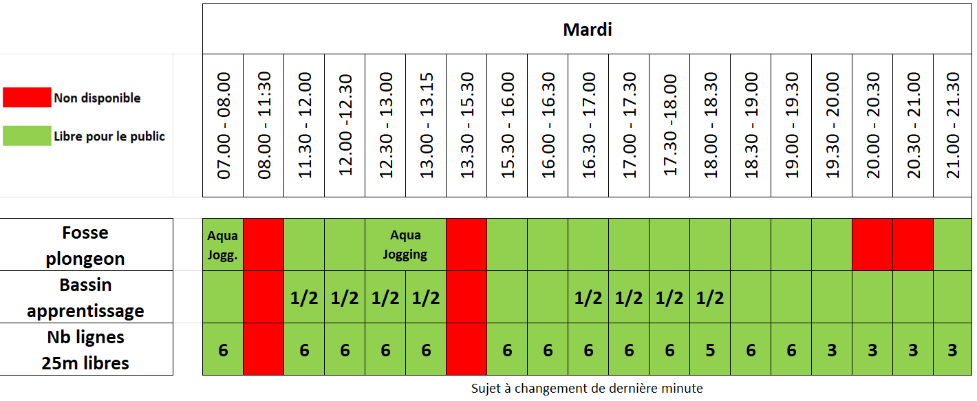 | Mardi | 07:00 – 08:00, 11:30 – 13:15, 15:30 – 21:30 |