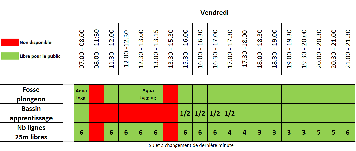 | Vendredi | 07:00 – 08:00, 11:30 – 13:15, 15:30 – 21:30 |